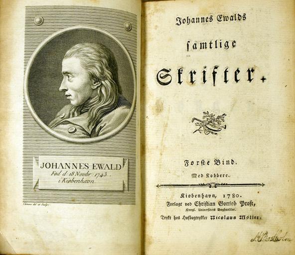 Keywords: Johannes Ewalds samtlige skrivter.jpg en Johannes Ewalds Samtlige Skrivter bind 1 fra 1780 Photo from the book of the same name Saddhiyama 26th of August 2008 Expired copyright PD-Art Johannes Ewald Books from Denmark