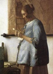| Keywords: Johannes Vermeer - Woman in Blue Reading a Letter (detail) - WGA24658.jpg Artwork Creator Johannes Vermeer Woman in Blue Reading a Letter between 1663 1664 Oil on canvas Institution Rijksmuseum object history credit line accession number WGA link 24658 http //www wga hu/art/v/vermeer/03a/18woman1 jpg http //www wga hu/html/v/vermeer/03a/18woman1 html PD-old-100 painting genre Dutch 1651-1700 WGA form painting WGA type genre WGA School Dutch WGA time period 1651-1700 Woman Reading a Letter by Johannes Vermeer |