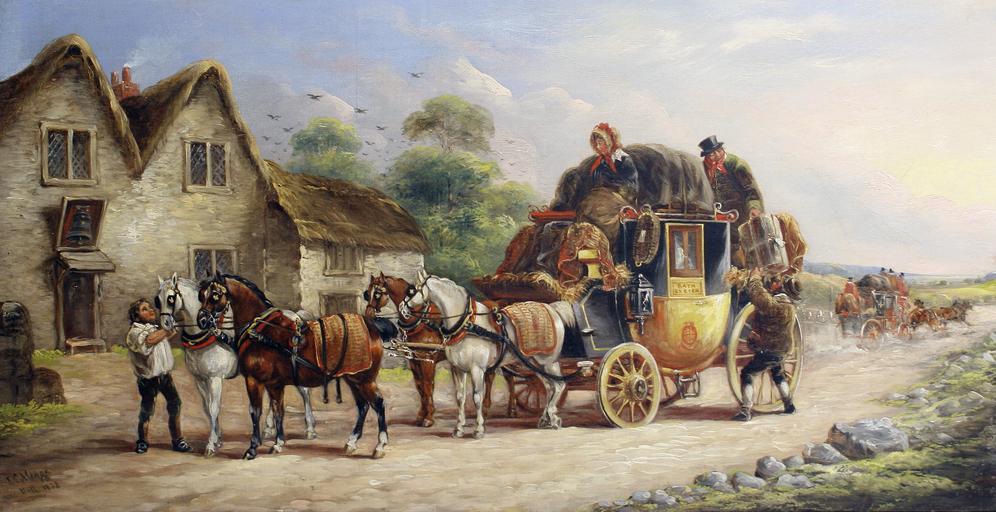 Keywords: John Charles Maggs - Royal Coach; Bath to Exeter Stage; Manchester to London Coach.jpg 1884 oil canvas cm 50 92 object history credit line signed 'J C Maggs' and dated 1872 accession number http //www bonhams com/auctions/17907/lot/119/ Bonhams PD-old-100 John Charles Maggs Coaches in art 1872 paintings Images from Bonhams |