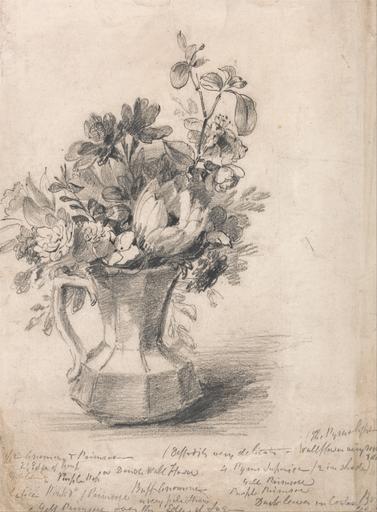 | Keywords: John Constable - Flowers in a Pitcher - Google Art Project.jpg Inscribed in artist's hand in graphite lower left to right Anemone Primrose / daffodil very delicate - The Pym ls Wallflower dark Edge of Pur Purl Double Wall Flower 4 Py Juh / 2 in shade pink primrose Buff Anemone Yell Primrose Purpl Primrose Yell Primrose over the Edge of the Jug Dark leaves in C Box Inscription _Signed_and_Dated Not signed not dated Not on View Graphite on medium slightly textured cream wove paper flowers pitcher vase sketch still life special url_id 9gGETEjwvYGHOg PD-old-100-1923 1837 Drawings by John Constable Google Art Project works by John Constable |
