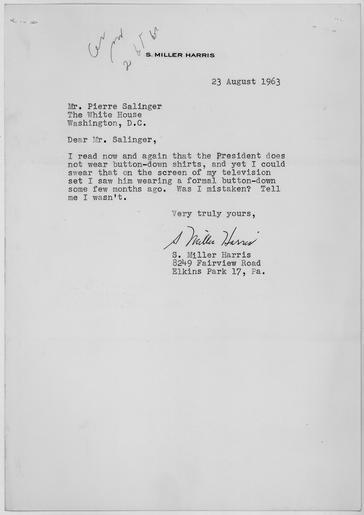 Keywords: John F. Kennedy and Button Down Shirts - NARA - 194138.tif Scope and content Inquiry concerning President Kennedy wearing a button down shirt General notes 194138 Local identifier President 1961-1963 Kennedy Office of the President 01/20/1961 - 11/22/1963 John F Kennedy Library NLJFK Columbia Point Boston MA 02125-3398 1963-08-23 Record group Collection JFK-WHCF Papers of President Kennedy White House Central Files 01/20/1961 - 11/22/1963 Record group ARC 1176 Papers of President Kennedy White House Central Files White House Subject File compiled 01/20/1961 - 11/22/1963 Series ARC 194123 File unit Papers of President Kennedy White House Central Files White House Subject Files President 01/20/1961 - 11/22/1963 File unit ARC 194135 Variant control numbers NAIL Control Number NLK-WHCF-SBJCTFL-PP1310GWEARAPP-LTRREJFKSHIRT yes Other versions NARA-cooperation PD-USGov Pierre Salinger Documents related to John F Kennedy