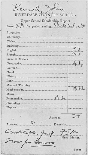 | Keywords: John F. Kennedy Riverdale Country School Report Card February 25, 1930 - NARA - 192826.tif Scope and content General notes 192826 Local identifier Kennedy John F John Fitzgerald 1917-1963 John F Kennedy Library NLJFK Columbia Point Boston MA 02125-3398 1930-02-25 Record group Collection JFK-JFKPP John F Kennedy Personal Papers 1917 - 1963 Record group ARC 1158 John F Kennedy Personal Papers Early Years compiled 1929 - 1940 Series ARC 192822 File unit John F Kennedy Personal Papers Early Years Correspondence 1929 - 1935 1929 - 1935 File unit ARC 192823 Variant control numbers NAIL Control Number NLK-JFKPP-ERLYYRS-COR1929TO1935-JFKRPTCRD022530 yes Other versions NARA-cooperation PD-USGov Documents related to John F Kennedy 1930 in the United States Riverdale Bronx School certificates |