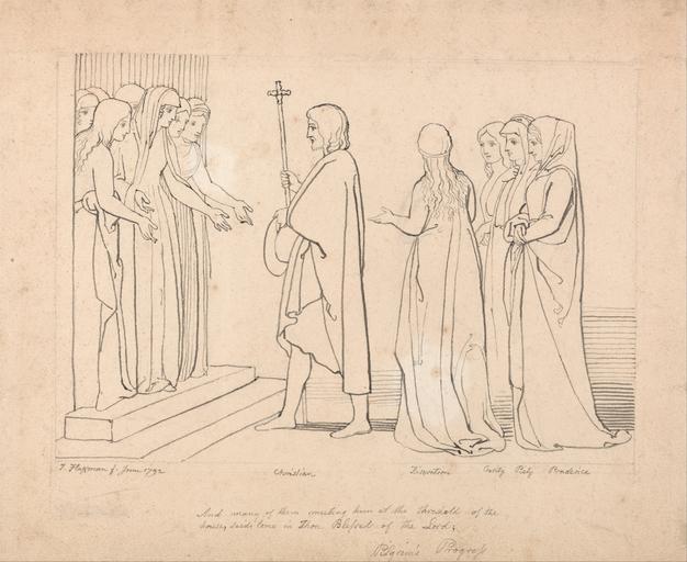 Keywords: John Flaxman - Illustration to Pilgrim's Progress - Google Art Project.jpg <nowiki>Inscribed in gray ink lower center Christian Discretion Charity Piety Prudence ; in gray ink lower center And many of them meeting turn at the threshold of the house said Come in Thou Blessed of the Lord; Pilgrim's Progress </nowiki> Inscription _Signed_and_Dated Signed and dated in gray ink lower left J Flaxman 8 June 1792 Not on view Black ink on medium slightly textured cream wove paper women crosses motifs men ceremonies procession steps robes historical subject special url_id JQF8IBNPOY48-w PD-old-100-1923 1826 John Flaxman Google Art Project works by John Flaxman Pilgrim's Progress |