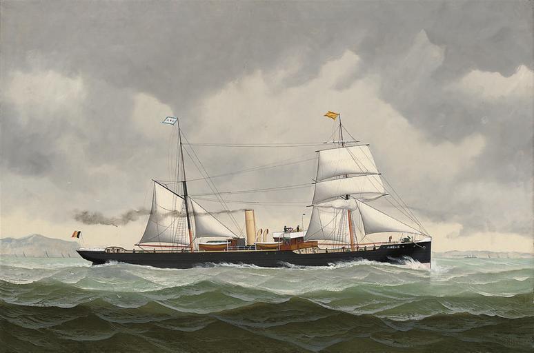 Keywords: John Henry Mohrmann - The Belgian steamer Amélie bound for Spain.jpg John Henry Mohrmann 1857 “ 1916 Originally named Olga and built for Hamburg owners A C de Freitas Co by G Howaldt at Kiel in 1883 the iron screw steamer Amélie assumed her new name when she was acquired by Adolf Depp of Antwerp in 1890 Registered at 1 114 tons gross 714 net she measured 226 feet in length with a 33 foot beam and was engined by Mdrkische of Berlin Although undated it is probable that this portrait of her was commissioned to mark her maiden departure from Antwerp under her new Depp colours <ref>http //www christies com/LotFinder/lot_details aspx intObjectID 5080341 Christie ™s</ref><small> reflist </small> possibly 1890 oil canvas in 24 36 object history credit line H Mohrmann ~ lower right signature accession number christies online 5080341 5386 168 London 21 May 2008 PD-old-auto-1923 1916 John Henry Mohrmann 19th-century sailing ships in paintings Amélie ship 1883 Paintings not categorised by year |