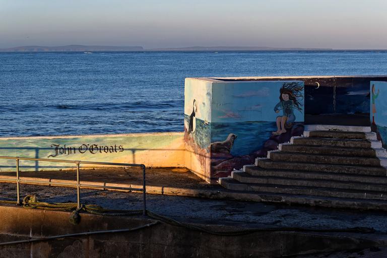 Keywords: john o'groats scotland john groats landmark o'groats tourism travel uk sea british tourist water scenic coastline coastal blue bay waves scenery sun sunshine sky sunset mural outdoor sky clouds autumn
