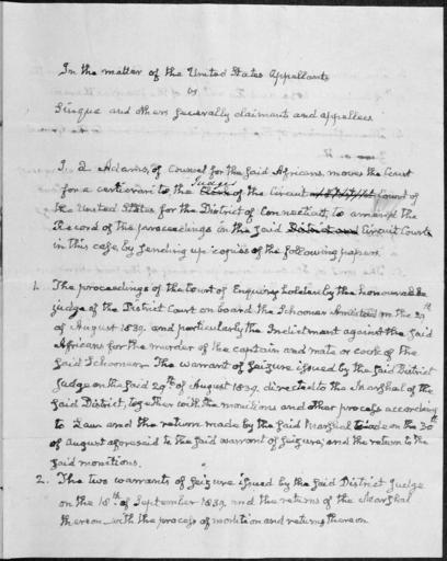 Keywords: John Quincy Adams' Request for Papers Relating to the Lower Court Trials of the Amistad Africans (Petition for... - NARA - 301671.jpg Scope and content In the trial before the Supreme Court the Africans were represented by John Quincy Adams a former U S President and descendant of American revolutionaries Preparing for his appearance before the Court Adams requested papers from the lower courts one month before the proceedings opened For 8 1/2 hours the 73-year-old Adams passionately and eloquently defended the Africans' right to freedom on both legal and moral grounds referring to treaties prohibiting the slave trade and to the Declaration of Independence General notes Exhibit no 624 0199 Exhibit History American Originals December 1997 - June 1998 National Archives Rotunda Washington DC Exhibit No 624 0199 The Rights of All April 1987 - July 1987 Schomburg Center New York NY Exhibit No 1040 0003 301671 Local identifier Supreme Court of the United States 02/02/1790 - Archives I Reference Section Textual Archives Services Division NWCT1R National Archives Building 7th and Pennsylvania Avenue NW Washington DC 20408 1841 Record group Record Group 267 Records of the Supreme Court of the United States 1772 - 2007 Record group ARC 594 Appellate Jurisdiction Case Files compiled 1792 - 2006 Series ARC 301668 File unit United States Appellants v The Libellants and Claimants of the Schooner Amistad her tackle apparel and furniture together with her cargo and the Africans mentioned and described in the several libels and claims Appellees 1839 - 1841 File unit ARC 561022 Variant control numbers NAIL Control Number NWCTB-267-PI139E21-2161 CERT <br /> NAIL Control Number NWDT1-267-PI139E21-2161 CERT <br /> Other Identifier 02485<br /> This is the NARA internal exhibit tracking number Other versions <gallery> File John_Quincy_Adams'_Request_for_Papers_Relating_to_the_Lower_Court_Trials_of_the_Amistad_Africans_ Petition_for _-_NARA_-_301671 tif tif File John_Quincy_Adams'_Request_for_Papers_Relating_to_the_Lower_Court_Trials_of_the_Amistad_Africans_ Petition_for _-_NARA_-_301671 jpg jpg </gallery> NARA-cooperation PD-USGov John Quincy Adams 1841 in the United States Supreme Court of the United States cases |