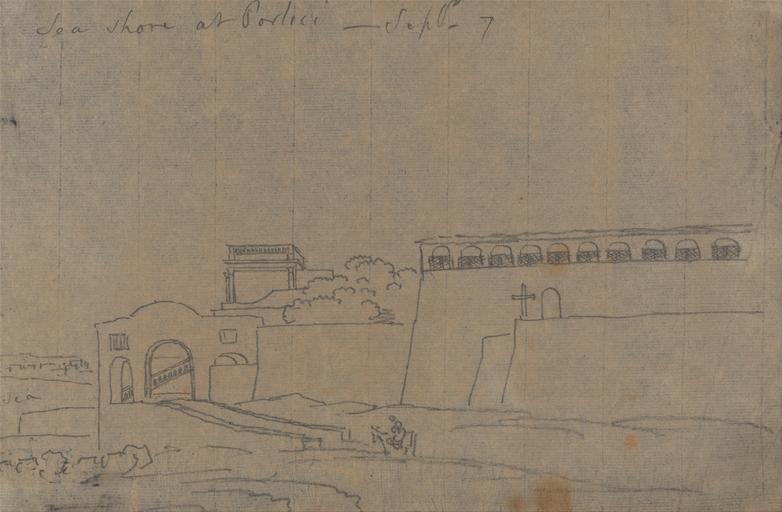 Keywords: John Robert Cozens - Sea Shore at Portici, September 7 - Google Art Project.jpg Inscribed in graphite upper left Sea Shore at Portici - Septr- 7 ; in graphite lower left sea ; in graphite lower left 120 Inscription _Signed_and_Dated not signed Not on View Graphite and varnish on thin slightly textured cream laid paper architectural subject arches walls gates shore landform coast trees buildings landscape special url_id iAEmnmYn7Zh-Nw PD-old-100-1923 1799 Portici by J R Cozens Google Art Project works by John Robert Cozens |