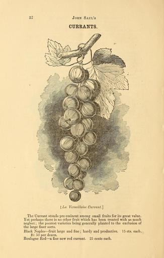 | Keywords: John Saul's descriptive catalogue of fruits (16250337287).jpg 32 <br> John Saul's <br> CURRANTS <br> La Versaillaise Currant <br> The Currant stands pre-eminent among small fruits for its great value <br> Yet perhaps there is no other fruit which has been treated with as much <br> neglect; the poorest varieties being generally planted to the exclusion of <br> the large finer sorts <br> Black Naples ” fruit large and fine ; hardy and productive 15 cts each <br> i 50 per dozen <br> Boulogne Ked ” a fine new red currant 25 cents each 42388200 134051 66774 Page 32 Text http //www biodiversitylibrary org/page/42388200 1870 10 5962/bhl title 66774 Henry G Gilbert Nursery and Seed Trade Catalog Collection ; John Saul Firm Washington D C Biodiversity Heritage Library John Saul's descriptive catalogue of fruits Garden Stories Catalogs Fruit Nurseries Horticulture Plants Seeds U S Department of Agriculture National Agricultural Library bhl page 42388200 dc identifier http //biodiversitylibrary org/page/42388200 bhlGardenStories La Versaillaise currant BHLinbloom nurseries horticulture u s department of agriculture national agricultural library bhlgardenstories la versaillaise currant bhlinbloom Information field Flickr posted date ISOdate 2015-02-03 CC-BY-2 0 BioDivLibrary https //flickr com/photos/61021753 N02/16250337287 2015-08-24 06 50 46 cc-by-2 0 PD-old-70-1923 John Saul's descriptive catalogue of fruits Photos uploaded from Flickr by Fæ using a script |