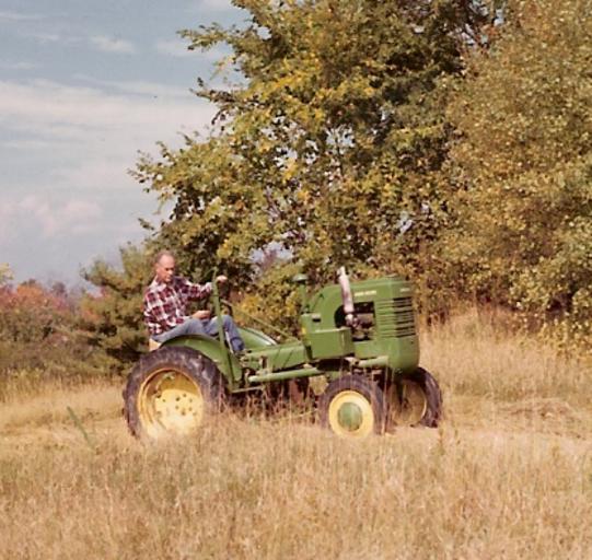 Keywords: JohnDeereModelLA.png en John Deere model LA tractor mowing a Windham Maine pasture Tractor was built in 1942 to replace a team of horses The two-cylinder engine was originally crank started but has been fitted with an electric starter with the battery box visible under the exhaust The sickle bar is mounted forward of the rear wheels and equipped with a covering shield to prevent damage by the over-riding wheel if the bar transitions to a trailing configuration upon encountering unsafe resistance to forward motion The tractor came equipped with a single 14-inch steel plow blade 1970-10 own Thewellman cc-zero Uploaded with UploadWizard John Deere letter series |