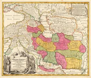 Keywords: Jomann Imperium Periscum.jpg en Map of Persia<br/> Copperplate print on paper colorized 53 × 60 7 cm<br/> Detailed map of the Persian empire extending from the Black Sea Khasikstan and Turkistan in the North to the Red Sea Persian Gulf Euphrates and the Mediterranean in the South showing a part of Cyprus Decorative map showing cities mountains rivers lakes roads etc Large decorative cartouche inthe lower left corner and smaller cartouche in the right upper corner http //www lot-tissimo net/ www lot-tissimo net - other date ca 1700 ca 1720 Creator Johann Baptist Homann Image extracted File Johann Baptist Homann Imperii Persici In Omnes Suas Provincias Caucasus JPG File Johann Baptist Homann Imperii Persici In Omnes Suas Provincias Circassia JPG File Johann Baptist Homann Imperii Persici In Omnes Suas Provincias Middle East JPG PD-old-100 Maps of the history of Iran Johann Baptist Homann Safavid Empire Maps Old maps of the Caucasus Old maps of Turkey Old maps of the Middle East Old maps of Iraq Old maps of Iran Old maps of Uzbekistan Maps made in the 18th century Old maps showing the whole Near East 18th-century maps of Armenia 18th-century maps of Azerbaijan Old maps of Shirvan |