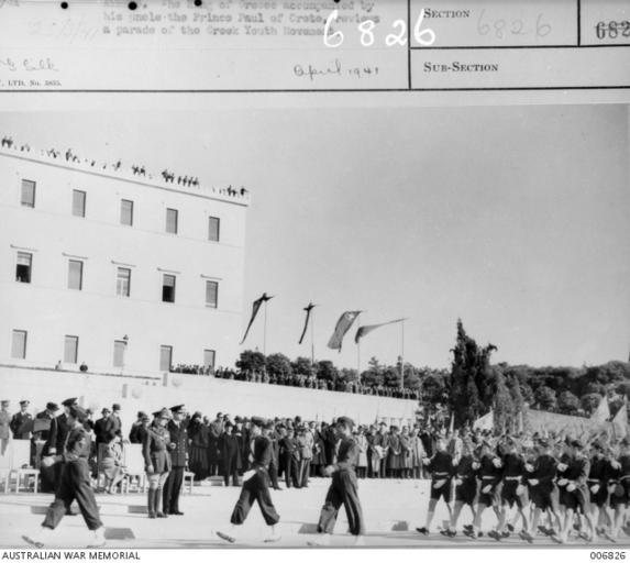 Keywords: JorgeIIDeGreciaYDEsfileDeEON25031941--006826.jpeg ATHENS THE KING OF GREECE ACCOMPANIED BY HIS UNCLE THE PRINCE PAUL OF CRETE REVIEWS A PARADE OF THE GREEK YOUTH MOVEMENT es Desfile de la Organización de la Juventud Griega EON en Atenas ante el rey Jorge II en abril de 1941 This image was sourced from the Australian War Memorial Collection 006821 Database http //cas awm gov au/item/006826 1941-03-25 D Parer PD-Australia Athens in World War II 1941 in Athens George II of Greece Paul I of Greece Independence Day Greece Black and white photographs National Youth Organisation Events at the Syntagma Square March 1941 in Greece 25 |