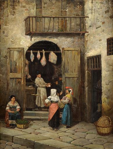 Keywords: Josep Juliana Albert La Macelleria 1874.jpg oil canvas cm 65 52 Roma 1874 signature / place / date object history credit line accession number http //www duesseldorfer-auktionshaus de/ Düsseldorfer Auktionshaus PD-Art PD-old José Juliana y Albert Butchers in art 1874 paintings Paintings of Rome Rome in the 1870s Shopping in art Butcher's shops Paintings with signatures lower right Paintings with years of production artist Images from Düsseldorfer Auktionshaus Paintings of courtyards and patios |