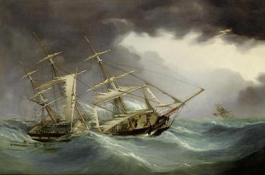 Keywords: Joseph Heard - painting of the Lord Ashburton being driven by the gale.jpg 1857 1859 oil on canvas cm 61 92 object history credit line The full-rigged Lord Ashburton was built at Workington in 1854 for Girvin Co of Liverpool and measured at 897 tons During her short life she traded out of Liverpool to North America mainly the Maritime Provinces of Canada She was however in Gibraltar in December 1856 from where she sailed for Toulon to load a cargo for Saint John New Brunswick On 19th January 1857 when nearly at her destination she was caught in a savage hurricane off Grand Manan Island in the Bay of Fundy just a few miles out from Saint John and sunk All her officers were drowned with only eight of twenty-nine crew saved <ref>http //www bonhams com/auctions/18922/lot/93/ Bonhams</ref><small> reflist </small> accession number 1 http //www wreckhunter net/DataPages/lordashburton-dat htm wreckhunter net<br/>2 http //www bonhams com/auctions/18922/lot/93/ Bonhams London 13 Sep 2011 lot 93 PD-old-auto-1923 1859 Joseph Heard Lord Ashburton ship 1843 Sea storms in art 19th-century sailing ships in paintings 19th-century paintings location missing Images from Bonhams |