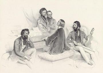 | Keywords: Joseph Kriehuber, Ein Matinée bei Liszt, 1846.jpg Hector Berlioz Carl Czerny Franz Liszt au piano Heinrich Wilhelm Ernst tenant son violon ark /12148/btv1b84265236 engraving Creator Joseph Kriehuber 1846 PD Copyright domaine public Josef Kriehuber Lithographs by Josef Kriehuber Engraved portraits of Hector Berlioz Carl Czerny Franz Liszt Heinrich Wilhelm Ernst PD-old-100-1923 | ||||