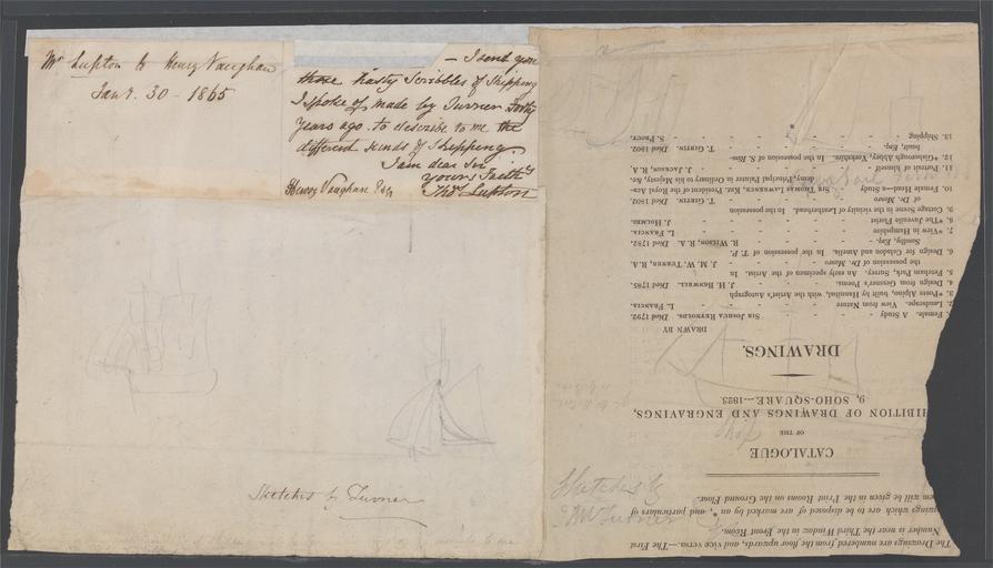 Keywords: Joseph Mallord William Turner - Sketch of Two Ships on a Catalogue Page - Google Art Project.jpg ~ 1823 London 1775 Chelsea 1851 Joseph male 2322909 Mallord William Turner British 1775 - 1851 /collection/yale-center-for-british-art/artwork/sketch-of-two-ships-on-a-catalogue-page-joseph-mallord-william-turner/2299728/ Joseph Mallord William Turner Artist /artist/j-m-w-joseph-mallord-william-turner/4127042/ 4127042 /collection/yale-center-for-british-art/ Yale Center for British Art 2305845 http //britishart yale edu/ 2/23/2012 10 27 39 PM /collection/yale-center-for-british-art/artwork/sketch-of-two-ships-on-a-catalogue-page-joseph-mallord-william-turner/2299728/ 1818 ca 1823 shipping ships sketch marine art catalogues Graphite on medium slightly textured cream wove paper adhered to medium slightly textured cream laid paper 225 2299728 False 1828 3/24/2012 11 07 37 AM YCBA/lido-TMS-5467 http //collections britishart yale edu/vufind/Record/1669732 Yale Center for British Art Paul Mellon Collection drawing 1810 1830 Chelsea Creation w422 x h225 cm ca 1823 False 1 74744027303754 Item sketch-of-two-ships-on-a-catalogue-page-joseph-mallord-william-turner Sketch of Two Ships on a Catalogue Page s 422 Inscribed in pen and brown ink upper left Mr Lupton to Henry Vaughan Janr 30 - 1865 - I send you these hasty scribbles of shipping I spoke of made by Turner forty years ago to describe to me the different kinds of shipping I am dear Sir yours Faith y Thos Lupton Henry Vaughan Esqr ; inscribed in graphite upper right are Turner ; in graphite lower center W B Cooke or G Cooke ; in graphite lower right Ship ; in pen and brown ink lower center Sketches by Turner ; in graphite lower left < > < > < > < > ; in graphite lower right Sketches by JMW Turner Esqr ; inscribed in graphite verso upper left Take care of this Inscription _Signed_and_Dated Not signed not dated Not on View Graphite on medium slightly textured cream wove paper adhered to medium slightly textured cream laid paper shipping ships sketch marine art catalogues special url_id oQFcsZm_s7CCEw PD-old-100-1923 1851 Google Art Project works by Joseph Mallord William Turner Drawings by Joseph Mallord William Turner |