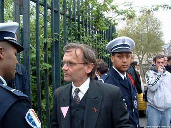 | Keywords: Journée Déportation Paris 2005 1.jpg fr 24 avril 2005 Journée nationale du souvenir de la déportation A Paris dans l'après-midi les associations LGBT ont participé aux cérémonies du Mémorial du martyr juif Le Mémorial de la Déportation Homosexuelle représenté de façon symbolique était convié parmi les associations représentant les déportés conformément aux instructions du Ministre délégué aux anciens combattants Cependant deux cérémonies et deux dépôts de gerbe distincts ont bien été organisés sur l'Ile de la Cité La délégation homosexuelle a dû attendre le départ des officiels pour pouvoir se recueillir Sur cette photo l'accès à la cérémonie officielle est interdit à la délégation homosexuelle ici représentée par Jean Le Bitoux Les militants LGBT devront attendre le départ des invités de la République pour pouvoir honorer à leur tour la mémoire des homosexuels morts en déportation own Franck D Zanni 2005-04 Demonstrations and protests in Paris LGBT journalists Jean Le Bitoux |