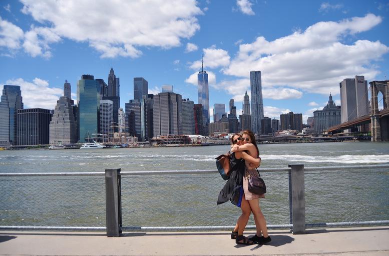 Keywords: joy welcome see you again hug luck happy look forward laugh cheer serene embrace friends intimate cling wrap brooklyn bridge pier port harbor water new york city urban buildings skyscrapers sky clouds skyline architecture outside