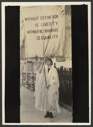 | Keywords: Joy Young 275038v.jpg Informal portrait full-length Joy Young facing forward standing outdoors on sidewalk with banner Without Extinction is Liberty Without Retrograde is Equality wearing white gown over her clothes Joy Young of New York City formerly of Washington D C was the wife of Merrill Rogers She worked as an assistant on the staff of The Suffragist and later became an organizer for the NWP in various parts of the country She was arrested picketing July 4 1917 and served three days in District Jail Source Doris Stevens Jailed for Freedom New York Boni and Liveright 1920 371 Title and information transcribed from item Photograph published in The Suffragist 4 no 53 Dec 30 1916 5 1 photograph print 7 x 5 in accession number Call Number Location National Woman's Party Records Group II Container II 275 Folder Individual Photographs Nos 504-510 Y Source Collection Records of the National Woman's Party institution Library of Congress Manuscript Division http //hdl loc gov/loc mss/mnwp 275038 PD-old suffragettes December 1916 in Washington D C |