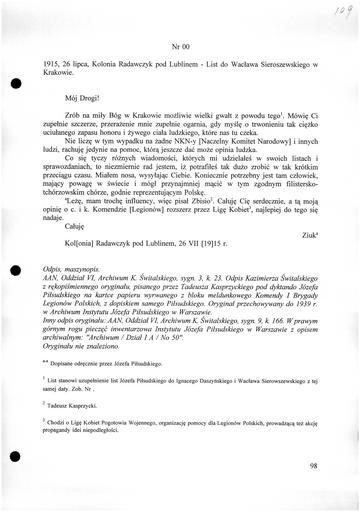| Keywords: Józef Piłsudski - List do Wacława Sieroszewskiego - 701-001-100-109.jpg Piłsudski Institute document pl List do Wacława Sieroszewskiego 1915-07-26 pl Prośba o nagłośnienie problemów z jakimi borykała się I Brygada pl Józef Piłsudski - listy; I Brygada pl Letter Kasprzycki Tadeusz Lublin <br/> Kraków 701/1/100/109 701 180/3274 3569 1 PD-old-auto-unpublished 1935 yes Collections of Józef Piłsudski Institute of America from 1915 Józef Piłsudski in 1915 Letters by Józef Piłsudski | ||||