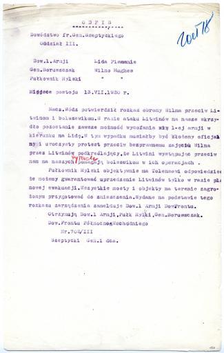 | Keywords: Józef Piłsudski - Rozkaz Naczelnego Wodza w sprawie obrony Wilna - 701-001-074-130.jpg Piłsudski Institute document pl Rozkaz Naczelnego Wodza w sprawie obrony Wilna 1920-07-13 pl Potwierdzenie rozkazu Naczelnego Wodza o obronie Wilna pl Wilno; Wojna polsko-bolszewicka pl Other Tolens <br/> Rylski <br/> Boruszczak <br/> Szeptycki Wilno <br/> Lida 701/1/74/130 701 180/2447 3138 Archiwum Józefa Piłsudskiego 1 PD-old-auto-unpublished 1935 yes Collections of Józef Piłsudski Institute of America from 1920 Józef Piłsudski in 1920 Polish-Soviet War Writings of Józef Piłsudski Military documents of Second Polish Republic |