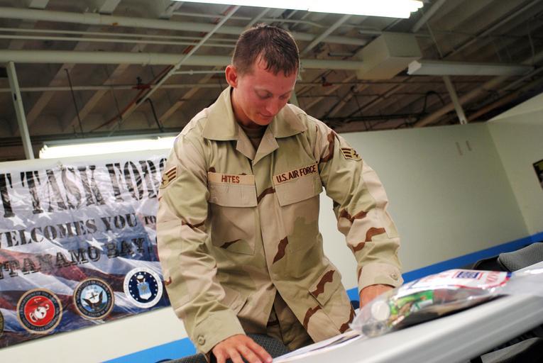 | Keywords: JPRC, the Accountability Masters of the Joint Task Force DVIDS85195.jpg en Air Force Senior Airman Mike Hites from Joint Task Force Guantanamo's Joint Personnel Reception Center arranges a welcome-aboard package for incoming JTF personnel in the Guantanamo Bay Naval Air Station Air Mobility Command Terminal on April 15 JPRC handles in-processing and out-processing for all JTF personnel JTF Guantanamo conducts safe and humane care and custody of detained enemy combatants The JTF conducts interrogation operations to collect strategic intelligence in support of the Global War on Terror and supports law enforcement and war crimes investigations JTF Guantanamo is committed to the safety and security of American service members and civilians working inside its detention facilities 2008-04-15 Petty Officer 2nd Class Nathaniel Moger https //www dvidshub net/image/85195 080415-N-+++++-005 2008-04-23 16 28 GUANTANAMO BAY CU PD-USGov-Military-Navy Joint Task Force Guantanamo Guantanamo Bay Images from DoD uploaded by Fæ |