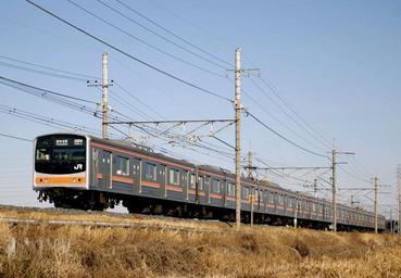 Keywords: JR East 205 Musashino-style.jpg A JR East 205 series 8-car EMU on the Musashino Line JR 日 205系電車 武蔵野線スタイル先頭車 口- 浦和間にて Own 2008-01-27 Sui-setz JNR 205 Musashino Line