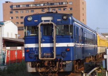 Keywords: JR West Kiha 23 507 Higashi Hagi.jpg en JR West Kiha 23 507 with Tsuyama livery just after its movement from Tsuyama to Ogori approaching HIgashi Hagi station ja 萩駅に 入するJR西日 キハ23 507を 後尾とする列車 キハ23 507は津山から転属してきた直後で 津山色と広島色が混結された姿 1993-10-10 own Hahifuheho other versions cc-zero JNR Kiha 23 JR West 1993 in rail transport in Japan October 1993 in Japan |