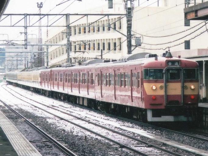 Keywords: JRE EC415 3colors.jpg en East Japan Railway Company EMU type 415 JNR color Tsukuba color stainless steel at Tsuchiura Sta JNR 415 JR East