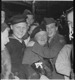| Keywords: Jubilant American soldier hugs motherly English woman and victory smiles light the faces of happy service men and... - NARA - 531280.tif Scope and content General notes Use War and Conflict Number 1354 when ordering a reproduction or requesting information about this image 531280 Local identifier 111-SC-205398 Department of Defense Department of the Army Office of the Chief Signal Officer 09/18/1947 - 02/28/1964 Still Picture Records Section Special Media Archives Services Division NWCS-S National Archives at College Park 8601 Adelphi Road College Park MD 20740-6001 other date circa 1900 1982 Record group Record Group 111 Records of the Office of the Chief Signal Officer 1860 - 1985 Record group ARC 440 Signal Corps Photographs of American Military Activity compiled 1754 - 1954 Series ARC 530707 File unit File unit ARC Variant control numbers NAIL Control Number NWDNS-111-SC-205398 yes Other versions NARA-cooperation PD-USGov London during World War II Piccadilly Circus in the 1940s |
