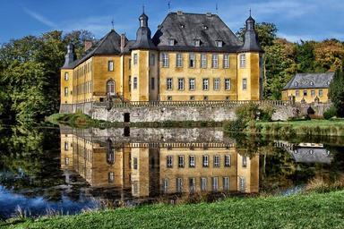 Keywords: juchen germany dyck castle building landmark historic destinations architecture water moat pond reflections trees sky clouds summer spring nature outside scenic hdr