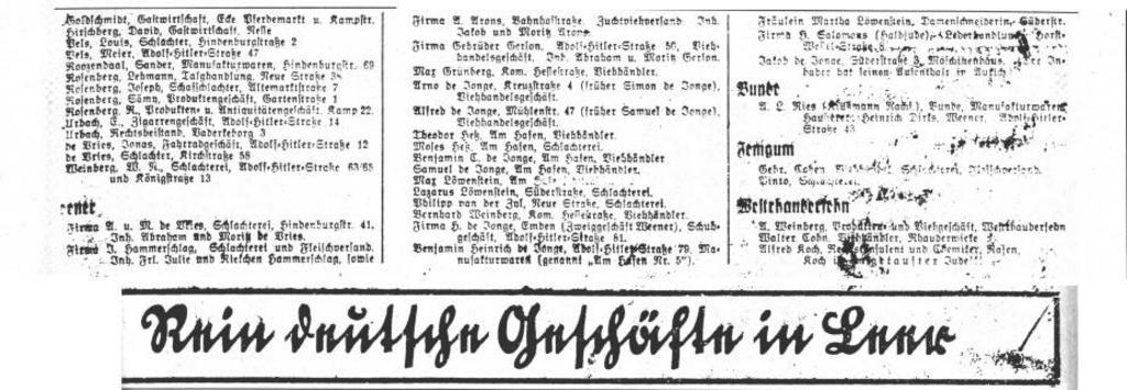 Keywords: Juden3.gif newspaper cutting taken from http //www rhaude de/umland/westrhauderfehn/juden/juden3 htm 1935-07-20 ostfriesische Tageszeitung OTZ 1935 Pure German Shops In Leer PD-Art East Frisia 1935