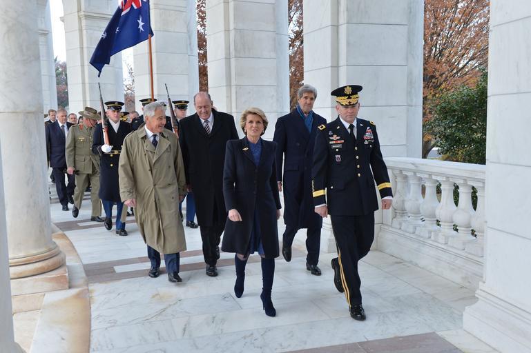 | Keywords: Julie Bishop, Chuck Hagel, John Kerry.jpg en U S Secretary of State John Kerry U S Secretary of Defense Chuck Hagel Australian Foreign Minister Julie Bishop and Australian Defence Minister David Johnston walk to the Tomb of Unknown Soldier to participate in a wreath laying ceremony at Arlington National Cemetery in Arlington Virginia on November 20 2013 2013-11-23 21 45 16 http //www flickr com/photos/statephotos/10964130666/in/photostream/ U S Department of State PD-USGov Uploaded with UploadWizard Julie Bishop John Kerry in 2013 Chuck Hagel in 2013 |