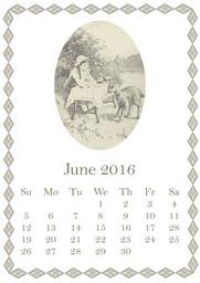 Keywords: june 2016 calendar girl child goat table countryside field grass tree spring summer diamond hat bell food water pond lake tablecloth happy animal