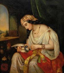 Keywords: Junge Frau mit Taubenpost.jpg Anonym Umkreis F v Amerling 19 Jh Junge Frau im orientalischer Kleidung mit Brieftaube Oil on canvas 42 x 35 5 cm http //www zeller de/ century 19 anonymous Public Domain PD-Art Pigeon post Images from Auktionshaus Zeller Carrier pigeons in art Females with pigeons in art Paintings of women with birds |