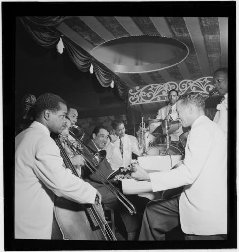 View Original:Junior Raglin, Lawrence Brown, Johnny Hodges, Duke Ellington, Ray Nance, Sonny Greer, Fred Guy, and Harry Carney, Aquarium, New York, N.Y., ca. Nov. 1946 (William P. Gottlieb 02371).jpg (1024x1078)