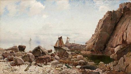 Keywords: Justus Lundegård - Segelskutor för ankar vid klippvägg.jpg Segelskutor för ankar vid klippvägg sv Justus Lundegård 1860-1924 1885-86 oil canvas cm 104 181 bukowskis se Justus Lundegård Paintings of ships PD-old-70