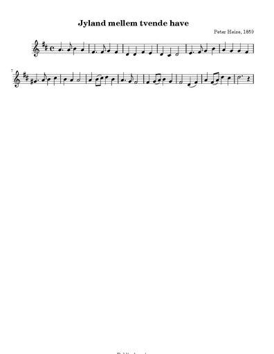 | Keywords: Jyland mellem tvende have.png Danish song written by H C Andersen in 1859 with Music by Peter Heise 1859 Lilypond <pre> <nowiki> \include deutsch ly \version 2 6 4-5 \header title Jyland mellem tvende have composer Peter Heise 1859 copyright Public domain melody \clef treble \time 4/4 \key d \major \relative c' a'4 a8 h4 a4 fis4 fis8 g4 fis4 d4 d4 fis4 e4 d4 cis4 d2 e4 fis8 g4 h4 a4 g4 g4 fis4 gis4 a8 h4 cis4 h4 a4 a2 a4 h8 cis8 d4 h4 a4 g8 fis2 fis4 g8 a8 h4 g4 fis2 d4 fis a fis8 a d4 cis d2 r4 \score \new Staff \melody </nowiki> </pre> Also See Jyland mellem tvende have mid Find midi here Violin for beginners thumb 250px left Music Sheet <br style clear both; > PD-old Music of Denmark |