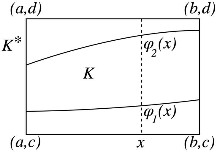 Keywords: KaisekiGairon-336-1.svg en A domain K defined by a< x< b and \varphi_1 x < y< \varphi_2 x and a rectangle domain K enclosing K 高 貞治:解析概論 改訂第三版[軽装版] p 336の図 tesigana 2011-01-21 PD-Japan 解析概論