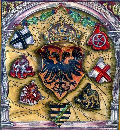 Keywords: Kaiserwappen des Heiligen Römischen Reichs 1545.jpg Titelseite mit Wappen eines Kaisers des Heiligen Römischen Reiches Deutscher Nation Jacob Koebel Vorrede Wapen Des Heyligen Römischen Reichs Teutscher nation Gedruckt bei Cyriacus Jacob evtl auch Herausgeber/Autor Frankfurt am Main 1545 Holzschnitte von Jacob Kallenberg Zu Angaben zur Tingierung Farbgebung der Wappen siehe das Register ab Bild Nr 165 Coats of arms of an emperor of the Holy Roman Empire Stemma di un Imperatore del Sacro Romano Impero della Nazione Germanica Ге б импе ато а Священной Римской импе ии из династии Габсбу гов Exemplar der Bayerischen Staatsbibliothek http //daten digitale-sammlungen de/bsb00059192/image_7 Scan des MDZ 1545 Text Jacob Koebel oder Cyriacus Jacob Holzschnitt Creator Jacob Kallenberg PD-art-100 <gallery> Wapen 1545 001 jpg </gallery> DEFAULTSORT Holy Roman Emperor Or shield coats of arms of Holy Roman Emperors Crowned lions in heraldry Imperial crowns Wapen des Heyligen Römischen Reichs Teutscher Nation Books in the Bayerische Staatsbibliothek |