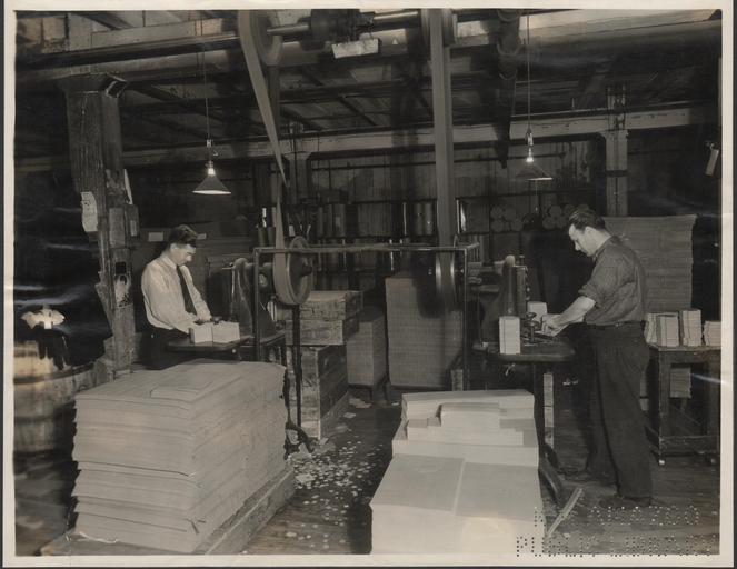 | Keywords: kalamazoo public library michigan history photography paper box company cutting workers men machines factory manufacturing Interior of Kalamazoo Paper Box Company, single corner cutting. Two unidentified men working at the machines. KPL catalogue number P-128. Interior of Kalamazoo Paper Box Company, single corner cutting. Two unidentified men working at the machines. KPL catalogue number P-128. | ||||