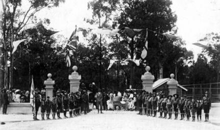 Keywords: Kalinga Park Honour Gates - Day of Opening Ceremony.jpg en The guard formed by local scouts and cubs at the Official Opening Ceremony of the Kalinga Park Honour Gates 23 Oct 1920 1920-10-23 scanned from a photographic print no attribution to photographer or studio is apparent on the print other versions -27 407900 153 051876 Diggers Dr Clayfield QLD 4011 Custom license marker 2015 09 25 PD-1923 PD-Australia Photograph of an event on 23-Oct-1920 Printed published in limited circulation a short time later Exact date unknown Photographer unknown - photo was/is sealed in what is presumed to be its original frame Uploaded with UploadWizard Uncategorized 2015 September 25 1