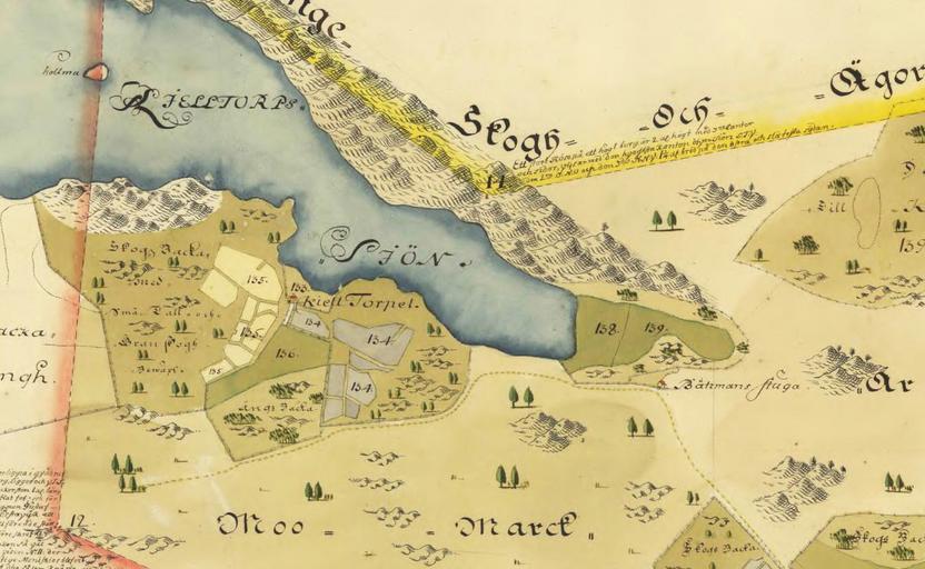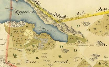 Keywords: Källtorp 1722.JPG sv Del av Erstaviks ägor visande Källtorp Lantmäteriet Lars Kietzlingh 1722 Källtorp Nacka kommun Källtorpssjön Snörom PD-old-100