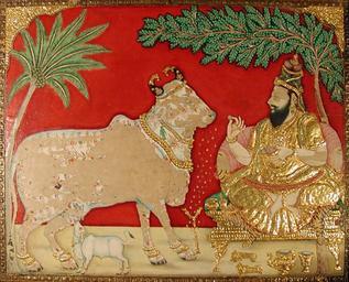 | Keywords: Kamadhenu and a Brahmin (6125146576).jpg en Creation Date ca 1830-1850 Display Dimensions 23 25/32 in x 30 5/8 in 60 4 cm x 77 8 cm Media Support Opaque watercolor gesso and gold on cloth and wood Creation Place/Subject India State-Province Karnataka Court Mysore School Mysore Credit Line Edwin Binney 3rd Collection Accession Number 1990 1431 Collection <a href http //www sdmart org/art/our-collection/asian-art rel nofollow >The San Diego Museum of Art</a> Label Copy November 2006 Paintings from South India The sensitive and tender depiction of the calf sucking from its mother the wish-fulfilling sacred cow Kamadhenu provides a glimpse of how she would have looked before the damage to her pigment Her entire body would have been covered with images of sages and deities including scenes from the life of Krishna Kamadhenu emerged as one of the treasures from the churning of the Ocean of Milk She is visible in the sky to the right of the mountain in The Churning of the Ocean of Milk at right A lavishly adorned royal sage probably Vishvamitra is seated under a tree on a low throne at the right and he venerates her with offerings of flowers 2002-04-26 17 35 03 https //www flickr com/photos/thesandiegomuseumofartcollection/6125146576/ Flickr en thesandiegomuseumofartcollection PD-old-100 Files from the San Diego Museum of Art to be checked |