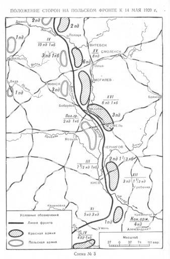 | Keywords: Kamenev map 3.jpg ru Схема 3 Положение сто он на польском ф онте к 14 мая 1920 г en Polish-Soviet front 14 05 1920 С С Каменев Бо ьба с белой Польшей Военный вестник 1922 N12 ст 7-17 Записки о г ажданской войне и военном ст оительстве Воениздат 1963 С С Каменев 1922 PD-old Maps of the Polish-Soviet War |