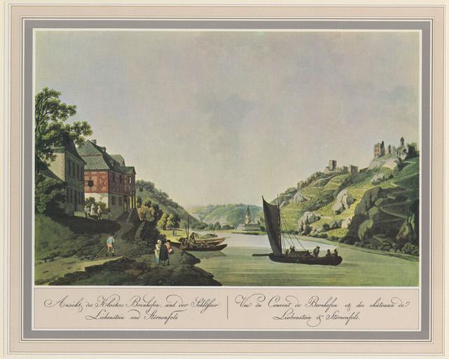 Keywords: Kamp-Bornhofen Die feindlichen Brueder Johann Andreas Ziegler.jpg Kamp-Bornhofen Die feindlichen Brüder; Kupferstich aquarelliert aus »Fünfzig malerische Ansichten Rhein-Stroms von Speyer bis Düsseldorf« erschienen bei Artaria in Wien 1798; nach Aquarellen von Laurenz Janscha die im Sommer 1792 entstanden http //images zeno org/Kunstwerke/I/big/561s016a jpg 1792 Creator Johann Andreas Ziegler PD-old-100 Fünfzig malerische Ansichten Rhein-Stroms von Speyer bis Düsseldorf Burg Liebenstein Rhein Kamp-Bornhofen Burg Sterrenberg Klosterkirche Bornhofen Images from zeno org |