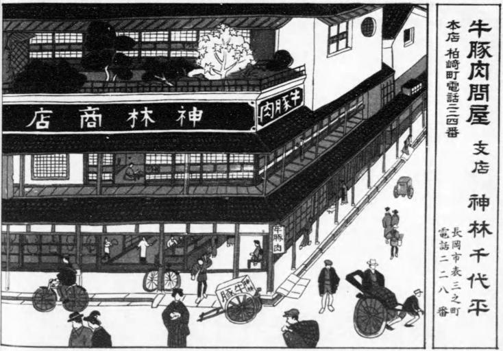 | Keywords: Kanbayashi Meat Shop in Taishō era.jpg ja 大正 の神林商店(現・神林精肉店)(新潟 長岡市) 絵画北越商工便覧 井政太郎編 大正8(1919)年刊より Nagaoka Niigata Prefecture Japan in Taishō era 1919 絵画北越商工便覧 ( 井政太郎編 大正8(1919)年刊) 国立国会図書館デジタルコレクション Japanese book Kaiga Hokuetsu Shōkō Benran published in 1919 Collection of books of the National Diet Library Japan http //dl ndl go jp/info ndljp/pid/967293/56 NDL http //dl ndl go jp/info ndljp/pid/967293/56 井政太郎 other versions 図内の文字 Characters in this figure 牛豚肉問屋 支店 神林千代平 長岡市表三之町 電話二二八番 店 柏崎町電話二二四番<br> 牛豚肉 神林商店 Custom license marker 2016 10 03 PD-Japan Kaiga Hokuetsu Shōkō Benran |