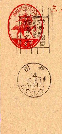 Keywords: Kanda 14.10.27.JPG ja 楠正成の銅像を描く官製はがきに押印された 京・神田郵便 の機械式郵便印 下記の標語は戦争のために国際を購入するように宣 するものである 投稿 人のコレクション 神田郵便 1939-10-27 PD-Japan Postmarks of Japan