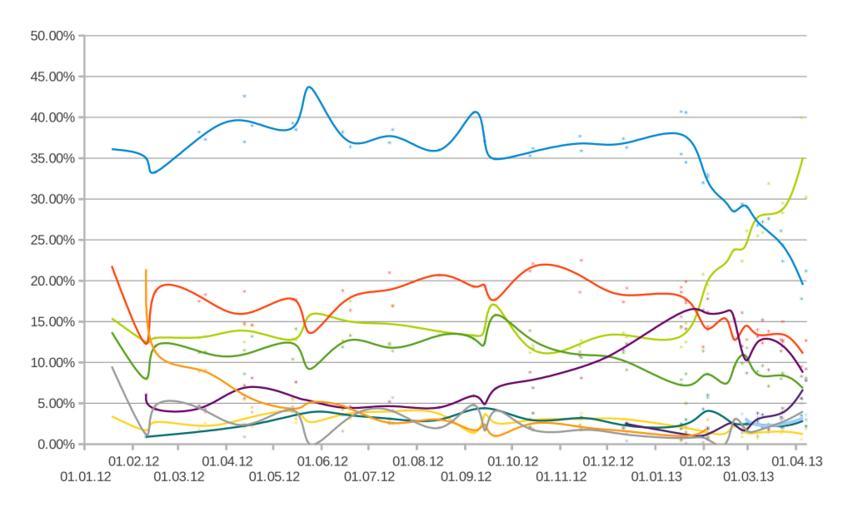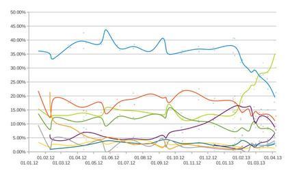 Keywords: Kannanirx2013.svg 1f52a6 Sjálfstæðisflokkurinn / Independence a7cc67 Framsóknarflokkurinn / Progressive 92278f Björt Framtíð / Bright Future ff2020 Samfylkingin / Social Democratic 669b41 Vinstrihreyfingin - grænt framboð / Left-Green 00cccc Hægri grænir / Right-Green ffd320 Dögun / Dawn 54306c Píratar / Pirate f38e20 Samstaða / Solidarity cccccc Aðrir / Other is skoðanakannanir í aðdraganda alþingiskosninga 2013 2013-02-04 03 25 07 own Bjarki S cc-zero Uploaded with UploadWizard Alþingi Political diagrams of Iceland Diagrams in Icelandic |