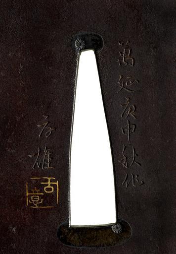 Keywords: Kano Natsuo - Tsuba with a Carp Leaping Out of Water - Walters 51397 - Mark A.jpg On the right side of this tsuba a carp is shown leaping from the water Its body arches to the left following the curve of the tsuba's edge At the upper left is a wasp that may be the carp's prey At the bottom waves show where the carp exited the water On the reverse are water and lily pads 1860 late Edo iron gold copper cm 10 2 accession number 51 397 26577 Henry Walters Baltimore date and mode of acquisition unknown Walters Art Museum Henry Walters Acquired by Henry Walters Date Manen ka-no-e saru aki saku; Signature Natsuo seal ; Translation Made in the autumn of the first year of Manen 1860 the year of the monkey/Natsuo place of origin Edo present-day Tokyo Japan Walters Art Museum license Tsuba in the Walters Art Museum Kano Natsuo Media contributed by the Walters Art Museum needs category review |