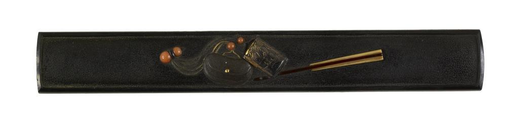 Keywords: Kanpo - Kozuka with a Fan, Medicine Box, Tabacco Pouch, and Netsuke - Walters 51697.jpg This kozuka is surrounded with a raised rim and the background Inside this frame are objects typically carried by men during the Edo period At the right is a fan made of tortoise shell and ivory Next to that in a medicine box inro which was used to carry other small objects in addition medicine Beside the medicine box is a tobacco pouch Both of these objects are attached to a gourd shaped netsuke made of coral The netsuke served as a counterweight to attach the medicine box and the tobacco pouch to the belt of a kimono The kozuka is signed on the back century 19 Edo-Meiji shakudo gold copper coral tortoise shell ivory cm 9 5 accession number 51 697 22240 Henry Walters Baltimore date and mode of acquisition unknown Walters Art Museum Henry Walters Acquired by Henry Walters Signature Jitokusai Kanpo place of origin Japan Walters Art Museum license Tosogu Japanese sword fittings in the Walters Art Museum Kanpo Media contributed by the Walters Art Museum needs category review Media contributed by the Walters Art Museum needs artist update Kozuka |